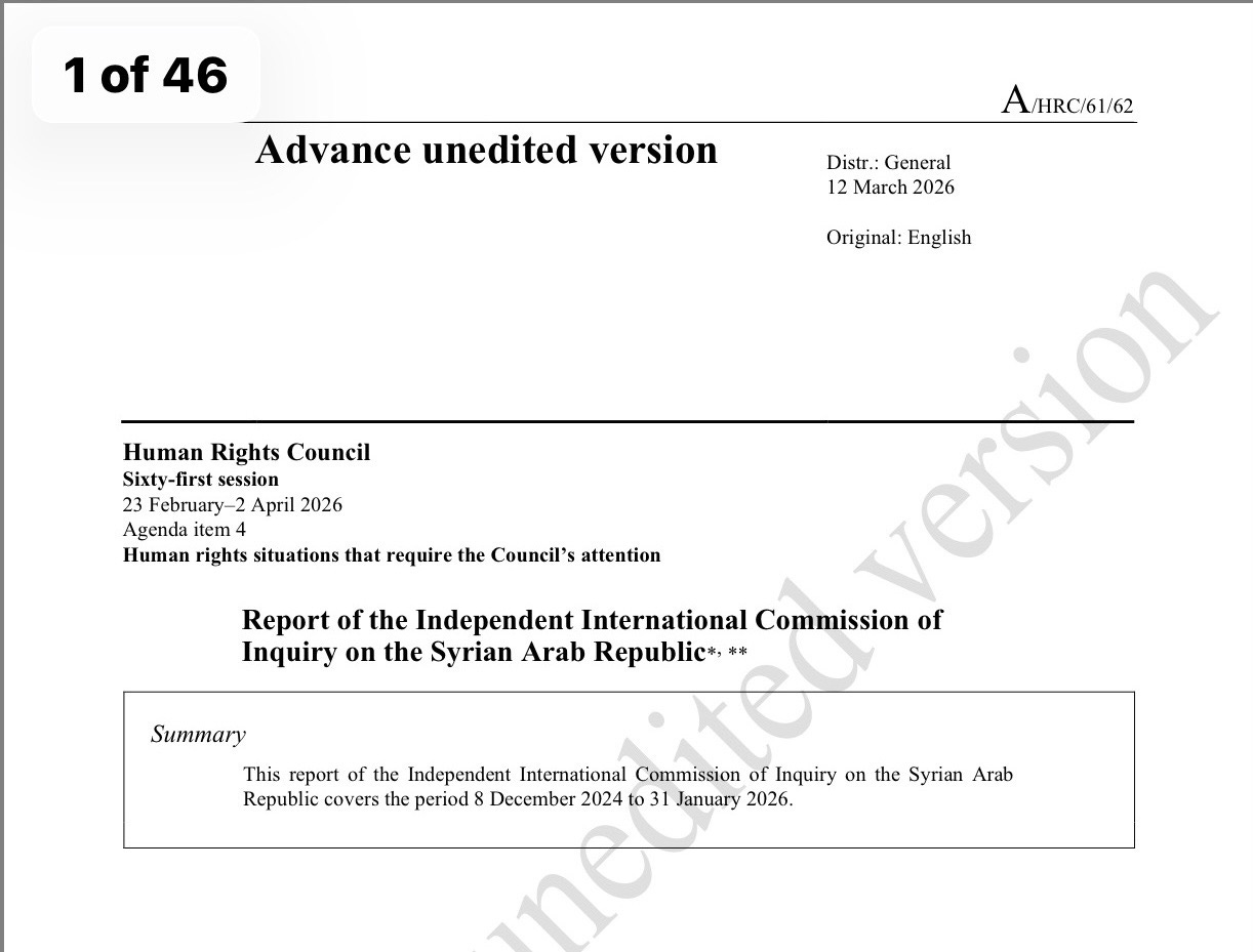 Bevor wir in diese Analyse einsteigen, erfordert es die gebotene PrĂ€zision, zwischen dem aktuellen Dokument (A/HRC/61/62) â einem allgemeinen Briefing zur Gesamtlage in Syrien â und dem spezifischen, noch ausstehenden Bericht der Kommission zu den Massakern von as-Suwaida zu unterscheiden. Die Auseinandersetzung mit diesem allgemeinen Bericht widerspricht keineswegs der Weisheit, die rechtliche Auswertung der kĂŒnftigen Ergebnisse abzuwarten; sie nimmt ihr vielmehr einen Schritt voraus. Wir unterziehen hier den geopolitischen Rahmen und die begriffliche Architektur des Berichts einer Analyse, um zu verstehen, wie Genf seine Beziehungen zum Machtzentrum in Damaskus legitimiert und welche internationalen Absichten bereits existieren, bevor die Details und der Schauplatz des Verbrechens, die der kommende Bericht offenbaren wird, ans Licht treten.